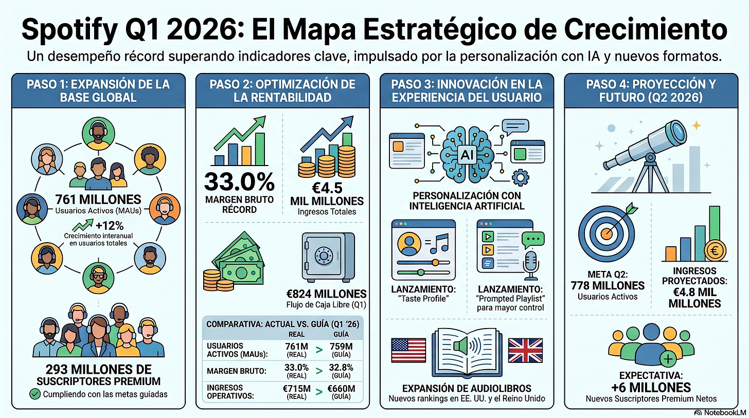El margen bruto alcanzó el 33%, un máximo histórico para un primer trimestre y 133 puntos básicos por encima del mismo período de 2025. Para entender la magnitud de esta mejora, hay que recordar que hace apenas cuatro años el margen bruto de Spotify rondaba el 25%. La compañía ha conseguido lo que muchos analistas consideraban casi imposible: crecer a doble dígito en usuarios mientras mejora simultáneamente su rentabilidad por usuario.